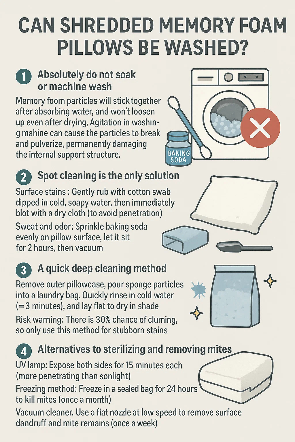 Îndepărtați perna exterioară și turnați particulele de burete într -o pungă de rufe. Clătiți rapid în apă rece (≤3 minute) și așezați -vă plat pentru a se usca la umbră (nu expuneți la lumina directă a soarelui sau la uscătorul de tumble).