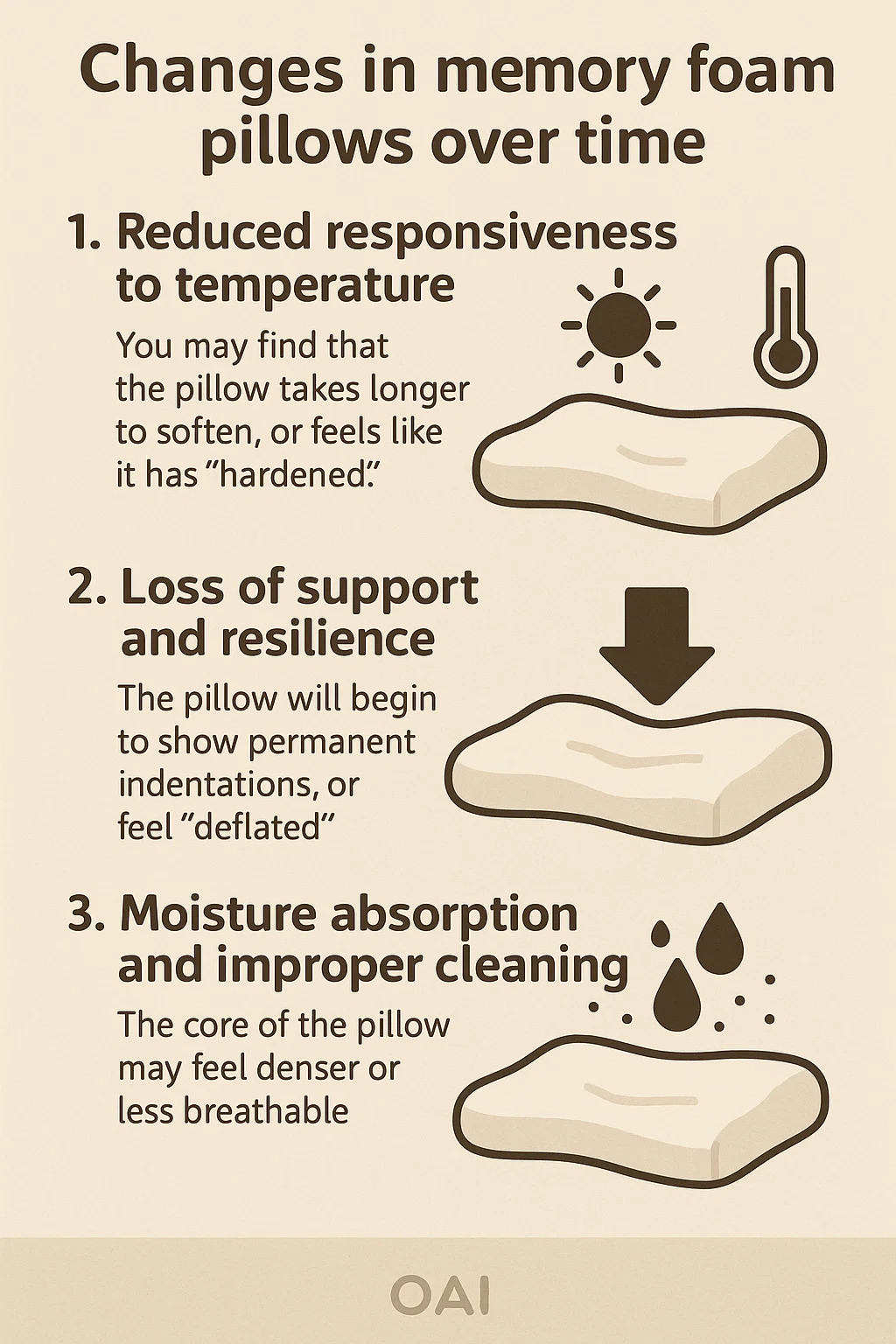 Pe măsură ce perna este folosită în timp, unele dintre componentele folosite pentru a forma spuma cu memorie se pot îmbătrâni treptat. Acest lucru poate duce la un răspuns mai lent la temperatura corpului și temperatura camerei.