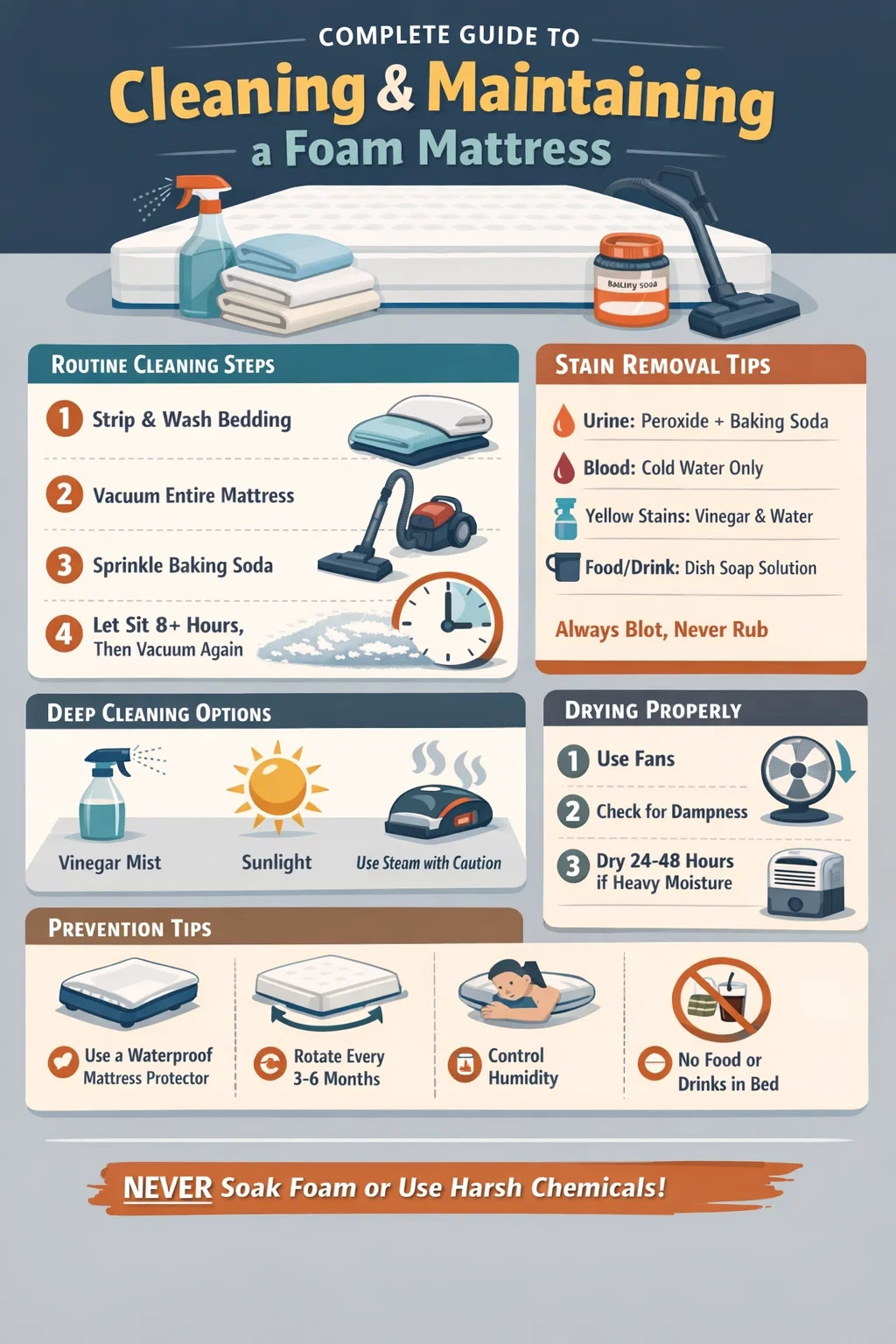 - Ignorarea instrucțiunilor de îngrijire ale producătorului: Unele saltele din spumă cu memorie folosesc formulări specifice de spumă brevetată care pot avea cerințe unice de îngrijire. Verificați întotdeauna eticheta de îngrijire sau site-ul web al producătorului înainte de a utiliza orice metodă de curățare pentru prima dată.