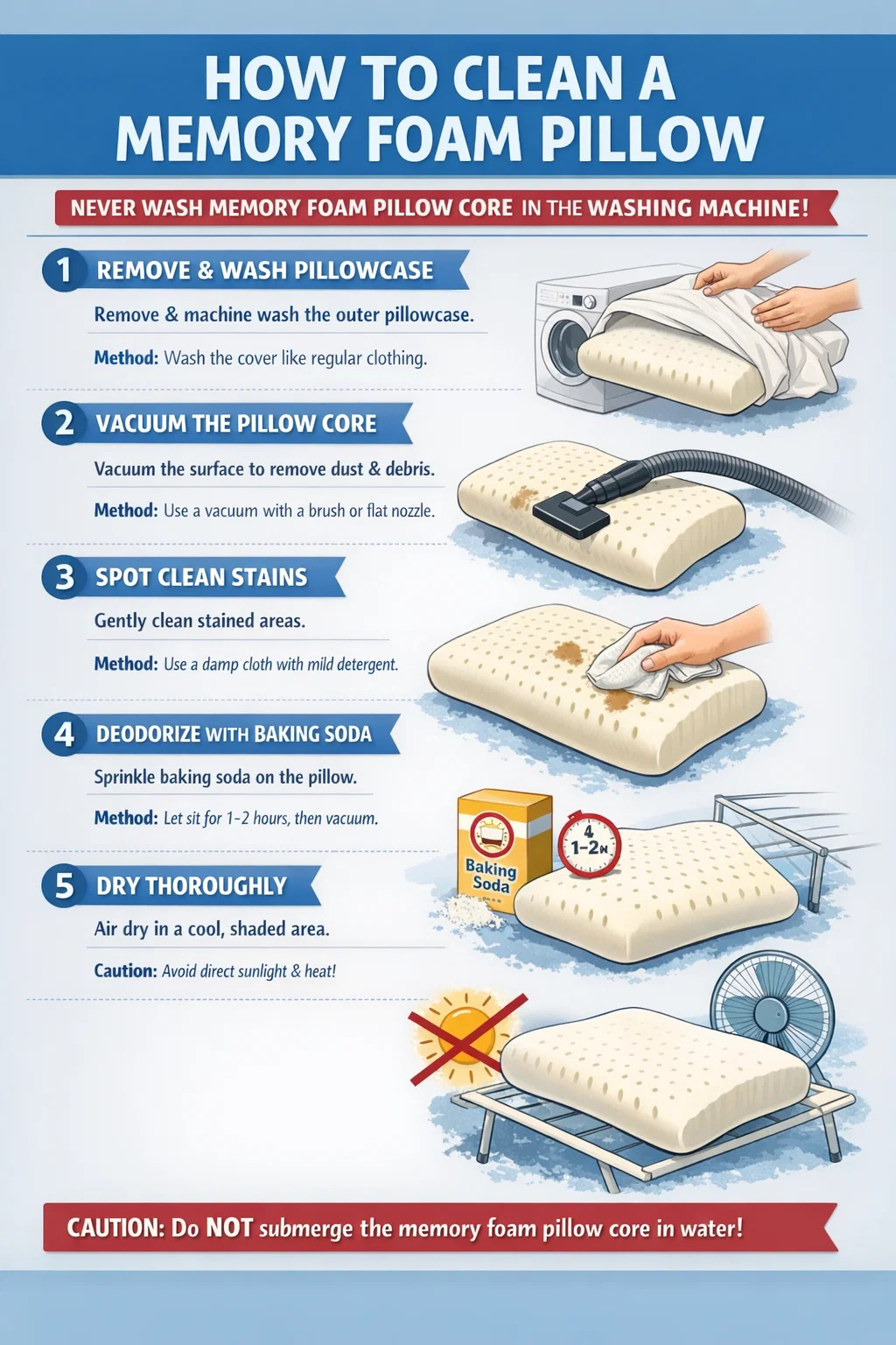 Deși „miezul pernei” nu poate fi spălat la mașină, vă puteți curăța în siguranță perna din spumă cu memorie urmând următorii pași: