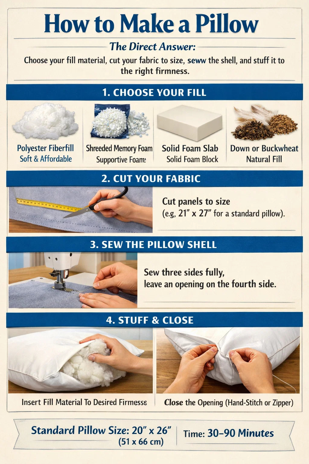 Realizarea unei perne se rezumă la patru elemente fundamentale: alegeți materialul de umplutură, tăiați materialul la dimensiune, coaseți coaja și umpleți-l la fermitatea potrivită. Pentru majoritatea oamenilor, o pernă standard de pat măsoară 20 × 26 inchi (51 × 66 cm) , iar întregul proces, de la tăierea materialului până la închiderea cusăturii finale, durează între 30 și 90 de minute, în funcție de tipul de umplutură. Dacă lucrați cu o pernă din spumă cu memorie, procesul diferă ușor, deoarece tăiați sau mărunțiți spuma mai degrabă decât umpleți cu fibre libere, dar abordarea structurală rămâne aceeași.