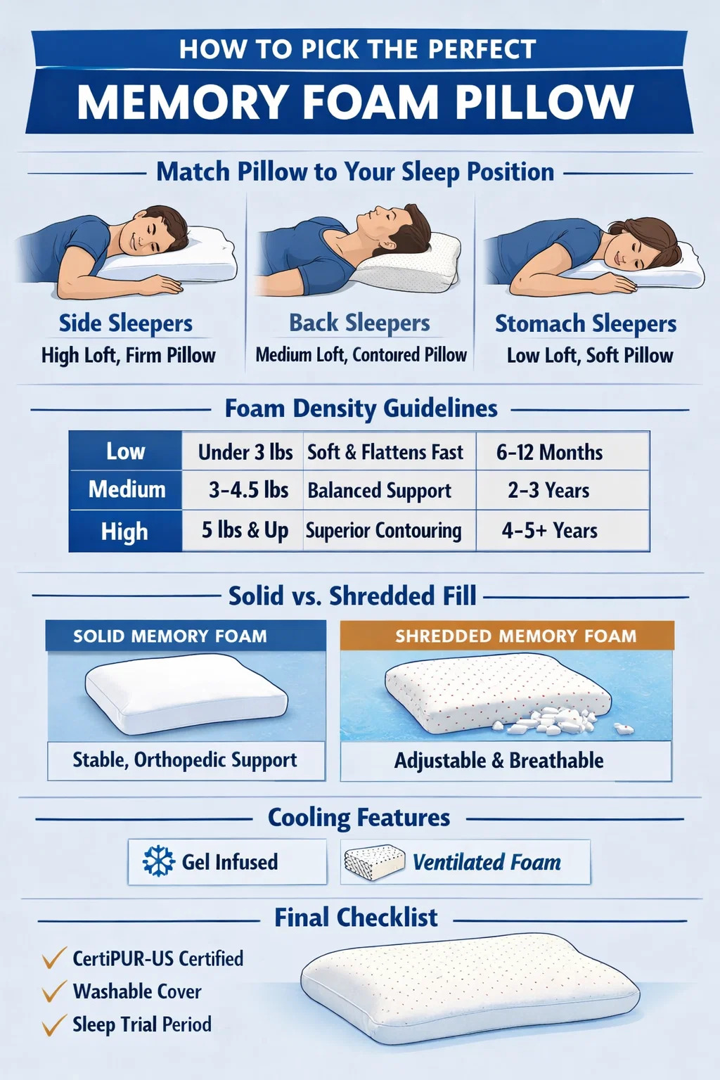 Pentru a alege corect pernă din spumă cu memorie , trebuie să potriviți „perna” (înălțimea) și „fermitatea” pernei cu poziția principală de dormit. Dormitorii laterali ar trebui să aleagă o pernă înaltă, fermă, pentru a umple golul din umăr; cei care dorm pe spate au nevoie de o pernă medie cu contur gât; iar cei care dorm pe stomac au nevoie de o spumă foarte subțire, moale sau de umplutură mărunțită. Dincolo de poziție, verificați întotdeauna densitatea spumei (țintați pentru 3,5 lbs/ft³ sau mai mult) pentru a asigura durabilitate și suport pe termen lung.