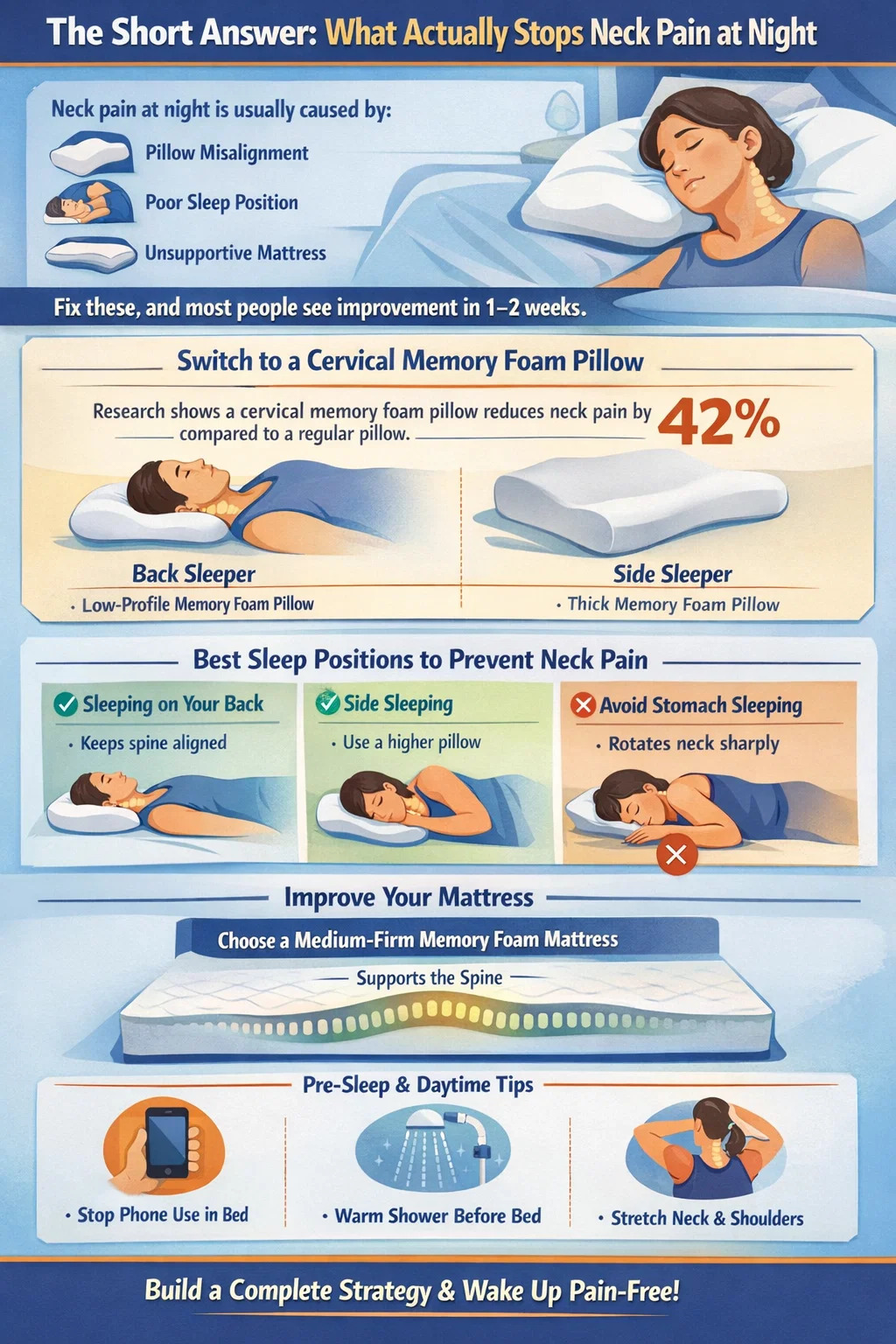 Majoritatea persoanelor care implementează toate cele cinci etape din această secvență raportează o reducere semnificativă și susținută a durerii de gât legate de somn în decurs de trei până la patru săptămâni. Combinația de susținere corectă a pernei prin produse din spumă cu memorie de calitate, poziție îmbunătățită de somn și acumulare redusă de tensiune în timpul zilei abordează problema din fiecare unghi simultan, în loc să se bazeze pe o singură soluție.