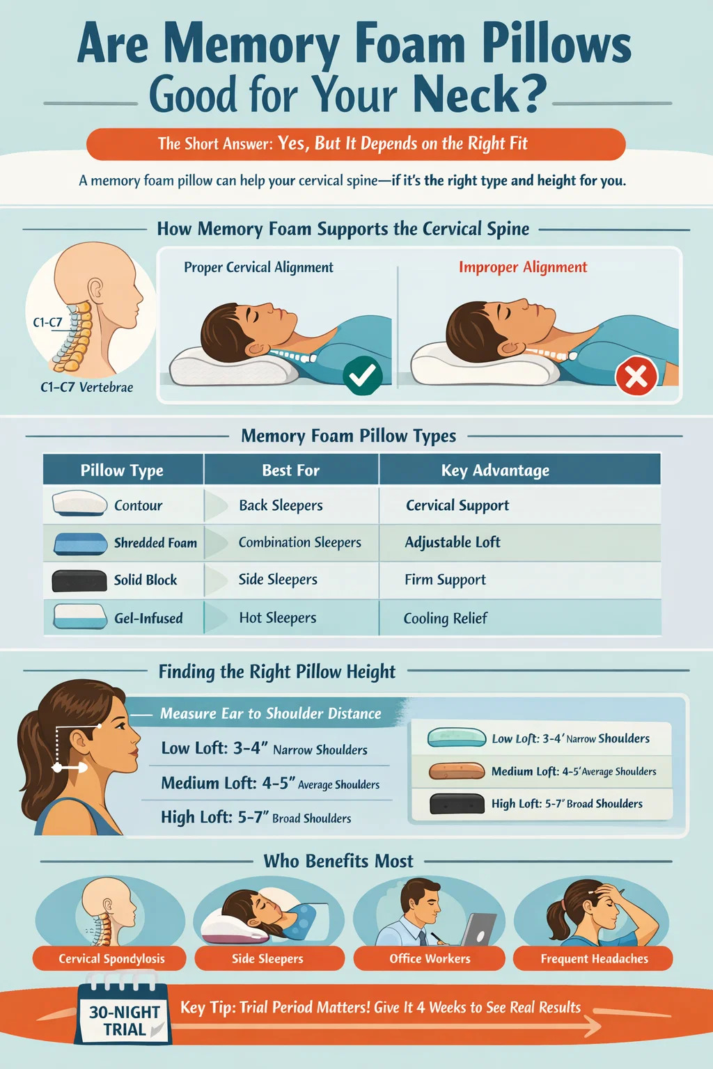 O pernă din spumă cu memorie poate fi cu adevărat benefică pentru coloana cervicală - dar numai atunci când se potrivește cu poziția ta de dormit, dimensiunea corpului și starea specifică a gâtului. Aceasta nu este o soluție unică pentru toate. Materialul în sine nu este magie; ceea ce face ca spuma cu memorie să funcționeze este capacitatea sa de a se conforma curbei naturale a gâtului și de a redistribui presiunea departe de articulațiile vertebrale sensibile. Studiile au arătat că înălțimea necorespunzătoare a pernei este una dintre principalele cauze ale durerii cronice de gât, iar structura adaptativă a spumei cu memorie ajută la rezolvarea acestui lucru prin eliminarea golurilor dintre gât și suprafața de dormit pe care pernele tradiționale le lasă adesea.