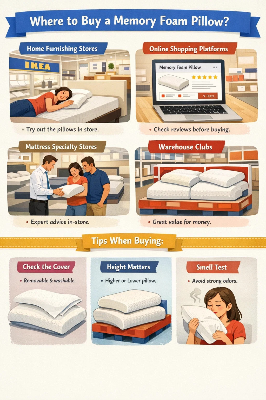 Dacă intenționați să cumpărați o pernă din spumă cu memorie, există multe locuri unde le puteți găsi. Cu toate acestea, diferitele canale de cumpărare au propriile avantaje și dezavantaje. Pentru a vă ajuta să găsiți cel mai potrivit, iată câteva locuri obișnuite pentru a le cumpăra și câteva sugestii: